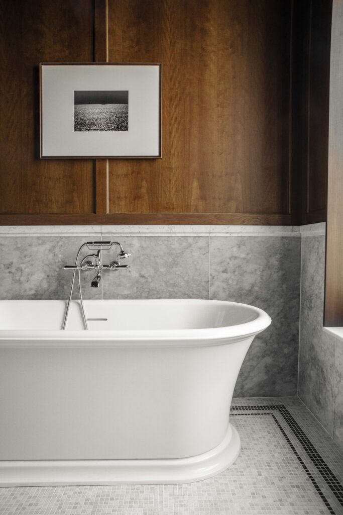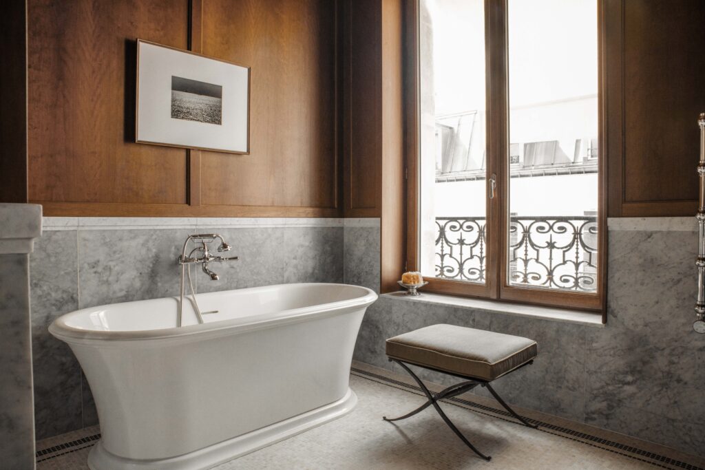 Guest rooms and suites reflect the same measured approach found throughout the hotel. Light settles gently across simple furnishings—sofas or armchairs placed with intention, leaving space to breathe. Views vary from quiet city streets to higher floors that open toward the rooftops, where a partial glimpse of the Eiffel Tower appears between chimneys. Bathrooms introduce a cooler rhythm: marble mosaic floors, clean lines, and a mix of bathtubs or showers. In some spaces, wood paneling warms the stone, creating a balanced contrast that feels quietly refined. On the upper level, the Terrace Suites extend this calm outdoors. A rooftop terrace offers room to pause and take in the surrounding neighborhood, from the curve of the Champs-Elysées to the steady silhouette of the Eiffel Tower. Inside, a separate living area and a bedroom maintain the same understated palette, while the marble-and-wood bathroom adds a grounded sense of material depth.