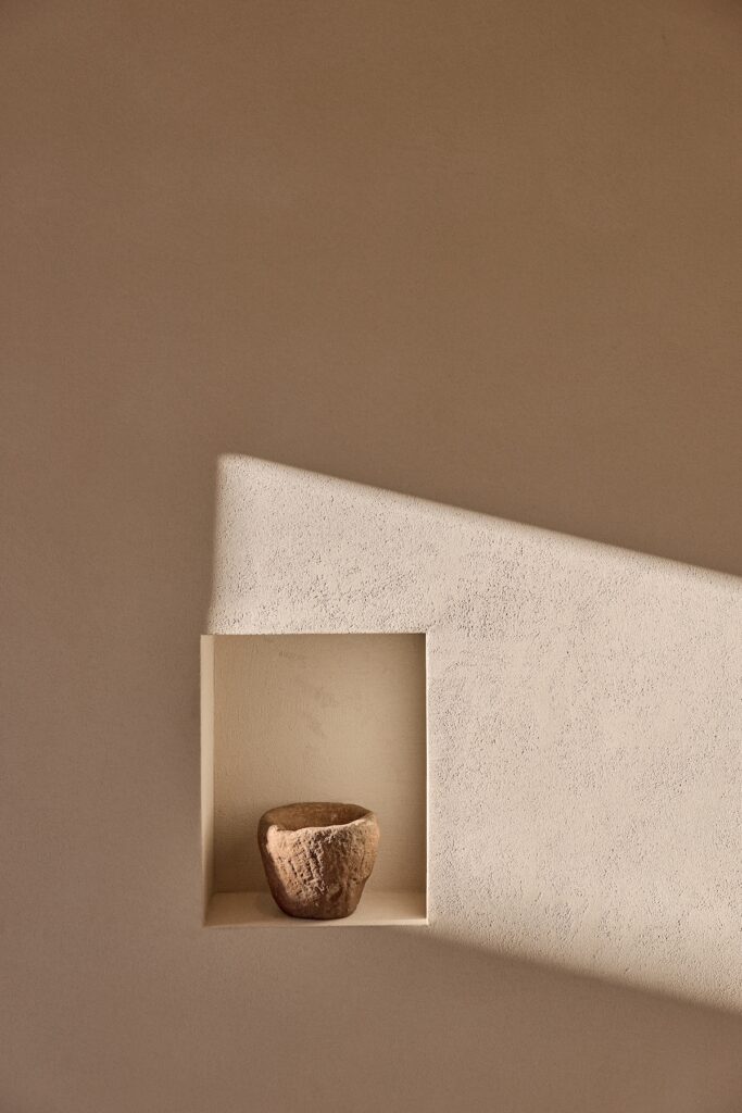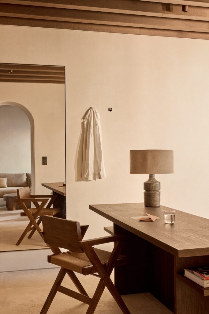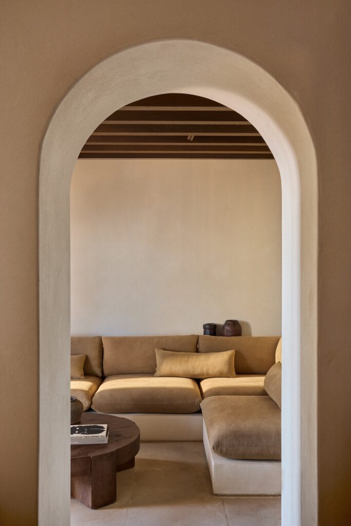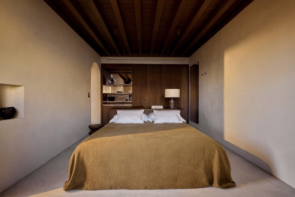 Opening this summer on the western cliffs of Paros, the adults-only property sits just fifteen minutes from the island’s airport and capital, Parikia, yet reads as genuinely secluded. The architecture works with the terrain rather than against it: raw plaster walls that absorb and shift light across the day, exposed wooden ceiling beams, and spaces that open generously toward the sea. Soft tones and considered materials carry through every area of the property, with art and objects chosen through the lens of local culture.